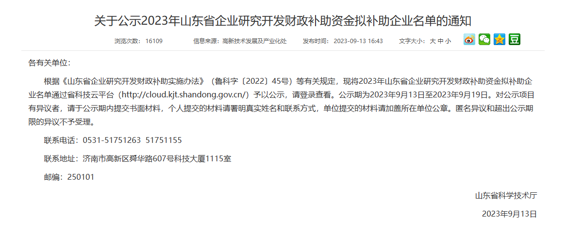 喜訊 | 我公司被列入2023年山東省企業研究開發財政補助資金擬補助企業名單